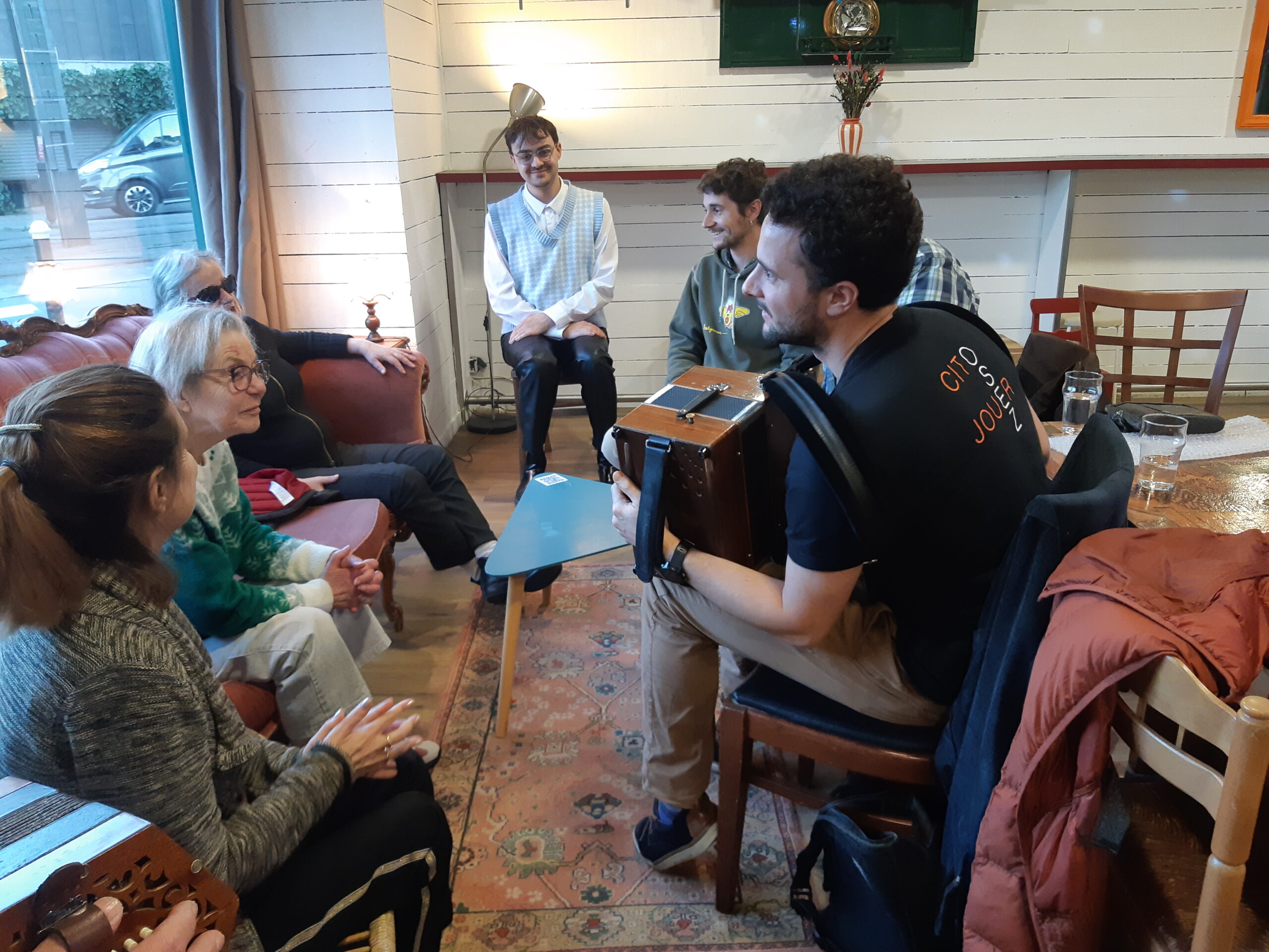 Nous étions huit à se retrouver, cinq non et malvoyants.es et trois voyants.es au Porte Vent (ancienne scène Michelet).Jean Louis nous a présenté son concertina qui est un instrument de musique à vent à anches libres